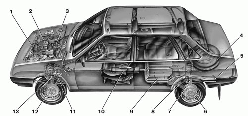 1.3. Компоновочная схема автомобиля ВАЗ-21099: 1 – радиатор; 2 – двигатель; 3 – карбюратор; 4 – запасное колесо; 5 – глушитель; 6 – барабанный тормоз; 7 – задняя амортизаторная стойка; 8 – балка задней подвески; 9 – топливный бак; 10 – резонатор; 11 – рычаг рулевой тяги; 12 – дисковый тормоз; 13 – передняя амортизаторная стойка