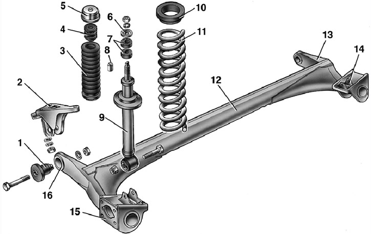 6.5. Детали задней подвески: 1 – резинометаллический шарнир; 2 – кронштейн крепления рычага подвески; 3 – кожух амортизатора; 4 – буфер хода сжатия; 5 – крышка кожуха; 6 – опорная шайба; 7 – подушка амортизатора; 8 – распорная втулка; 9 – амортизатор; 10 – изолирующая прокладка; 11 – пружина задней подвески; 12 – соединитель рычагов; 13 – рычаг балки задней подвески; 14 – кронштейн крепления амортизатора; 15 – фланец; 16 – втулка рычага