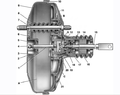 8.2. Вакуумный усилитель: А – вакуумная камера; В – атмосферная камера; С, D – каналы; 1 – шток; 2 – уплотнительное кольцо фланца главного цилиндра; 3 – чашка корпуса усилителя; 4 – регулировочный болт; 5 – уплотнитель штока; 6 – возвратная пружина диафрагмы; 7 – шпилька усилителя; 8 – уплотнительный чехол; 9 – корпус усилителя; 10 – диафрагма; 11 – крышка корпуса усилителя; 12 – поршень; 13 – защитный чехол корпуса клапана; 14 – воздушный фильтр; 15 – толкатель; 16 – возвратная пружина толкателя; 17 – пружина клапана; 18 – клапан; 19 – втулка корпуса клапана; 20 – буфер штока; 21 – корпус клапана