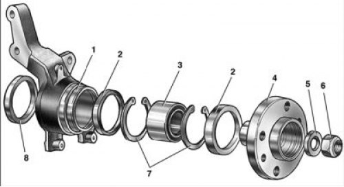 1 – поворотный кулак; 2 – наружное грязеотражательное кольцо; 3 – подшипник ступицы; 4 – ступица колеса; 5 – упорная шайба; 6 – гайка; 7 – стопорные кольца; 8 – внутреннее грязеотражательное кольцо.