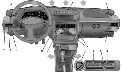 Воздушные потоки в салоне распределяются через воздуховоды, расположенные внутри панели приборов. Перемещением рычага 2 поток воздуха направляют как в зону ног водителя и пассажиров, так и через центральные 8 и боковые 7 сопла в салон автомобиля. Поворачивая направляющие лопатки центральных и боковых сопел рычагами 9 и 11, изменяют направление воздушного потока.