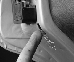 Рычаг этого устройства находится в торце задней двери, доступ к нему возможен только при открытой двери. Для блокировки опустите рычаг вниз. При включенном «детском» замке и поднятой кнопке блокировки заднюю дверь можно открыть только снаружи.