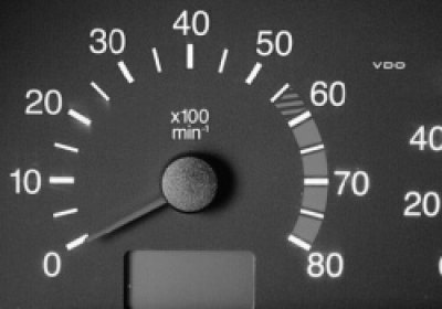 2 — тахометр электронного типа показывает частоту вращения коленчатого вала двигателя. На шкалу нанесены деления от 0 до 80, цена деления 5. Чтобы узнать частоту вращения коленчатого вала, нужно показания тахометра умножить на 100. Заштрихованная красная зона шкалы означает режим работы двигателя с высокой частотой вращения, сплошная красная зона — опасные для двигателя режимы;