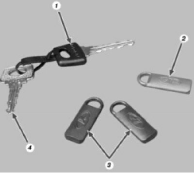 Так выглядит комплект ключей автомобиля: 1 — ключ зажигания; 2 — электронный обучающий ключ иммобилизатора; 3 — электронные рабочие ключи иммобилизатора; 4 — ключ для замков дверей и багажника.