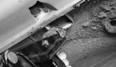 Так устанавливают домкрат в гнездо для лапы домкрата при поднятии переднего колеса. Заднее колесо поднимают аналогично.