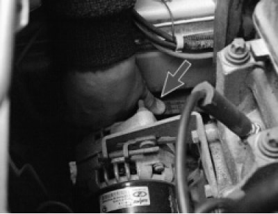 Нормальное натяжение обеспечивается при прогибе ремня 10-15 мм. Если ремень плохо натянут, ослабьте затяжку гаек нижнего и верхнего креплений генератора и, вращая регулировочный болт по часовой стрелке (показан стрелкой), отодвиньте генератор от двигателя. Затяните гайки крепления генератора.