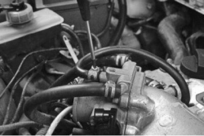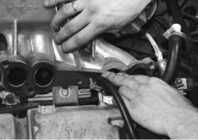 14. Ослабьте хомут и отсоедините от штуцеров на ресивере вакуумные шланги усилителя тормозов и регулятора давления топлива.