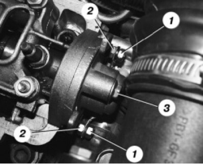 4. Отверните две гайки 1 крепления «массовых» проводов и снимите наконечники проводов со шпилек. Затем отверните две гайки 2 и болт 3 крепления задней крышки головки блока. Обратите внимание: под головкой болта установлено уплотнительное кольцо. Снимите заднюю крышку с головки блока.