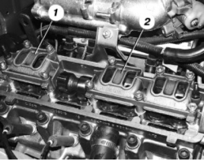 5. Отверните равномерно четыре гайки крепления переднего 1 и шесть гаек крепления заднего 2 корпусов подшипников распределительного вала и снимите шайбы. Затем снимите оба корпуса.