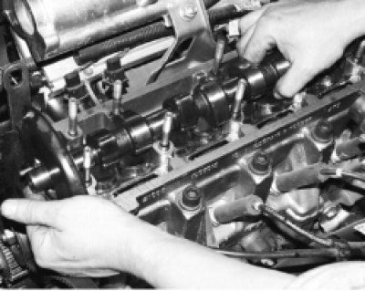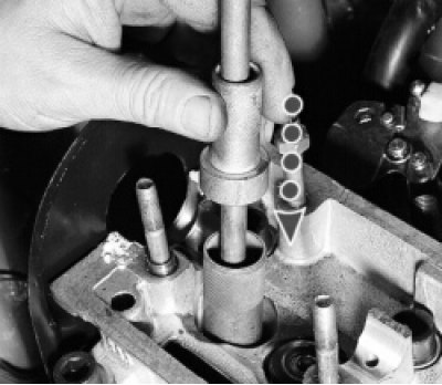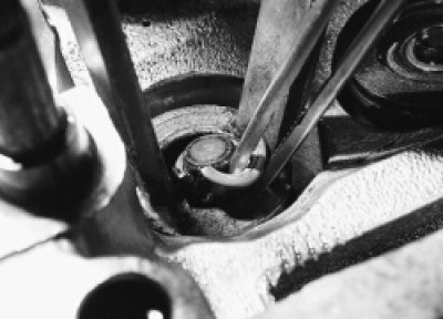 9. Проверните коленчатый вал так, чтобы поршень, соответствующий заменяемым колпачкам, находился в верхней мертвой точке. Вывернув свечу, вставьте оловянный пруток через отверстие для свечи между поршнем и клапаном (чтобы клапан не провалился вниз).