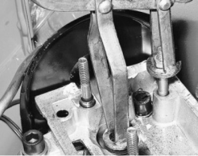 3. Снимите зубчатый шкив с распределительного вала (см. «Замена прокладки головки блока цилиндров» в подразделе «Замена деталей уплотнения двигателя»).