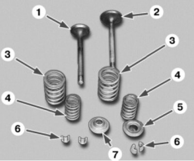 1 , 2 — клапаны; 3 — наружная пружина; 4 — внутренняя пружина; 5 — верхняя тарелка; 6 — сухарь; 7 — нижняя тарелка. Для замены или притирки клапанов все детали нужно снять с головки блока цилиндров.