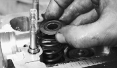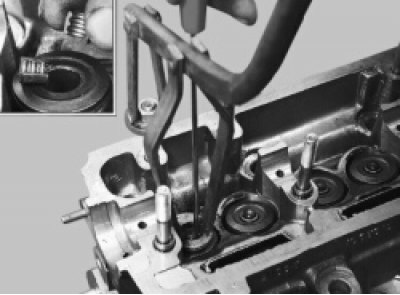 33. Установите приспособление для сжатия пружин клапанов и сожмите пружины клапана. Выньте с помощью отвертки или пинцета два сухаря.