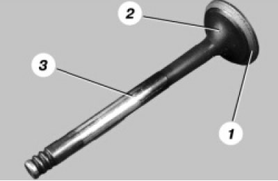 40. Замените клапаны со следующими дефектами: глубокие риски и царапины на рабочей фаске 1, трещины, деформация стержня 3 клапана, коробление тарелки 2 клапана, следы прогара. Неглубокие риски и царапины на рабочей фаске можно вывести притиркой клапанов [см. «Притирка клапанов» в подразделе «Головка блока цилиндров» (ремонт)].