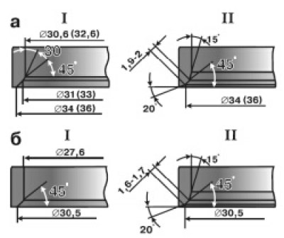 4.9. Размеры седел клапанов: а — седло впускного клапана; б — седло выпускного клапана; I — новое село; II — седло после ремонта