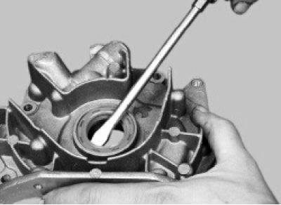 2. С помощью отвертки выньте сальник из крышки масляного насоса.