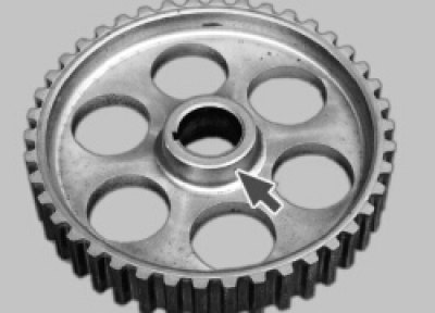 9. Установите все детали в порядке, обратном снятию. Шкив распределительного вала устанавливайте выступающей частью ступицы к двигателю. Отрегулируйте натяжение ремня привода распределительного вала (см. «Замена ремня привода распределительного вала и регулировка натяжения ремня»).
