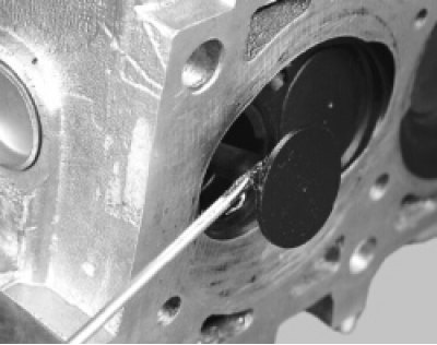 7. После притирки тщательно протрите клапан и седло чистой тряпкой и промойте для удаления остатков притирочной пасты. Проверьте герметичность клапана, для чего установите его в головку с пружинами и сухарями. Затем положите головку набок и залейте керосин в тот канал, который закрыт клапаном. Если в течение 3 мин керосин не просочится в камеру сгорания, клапан герметичен.