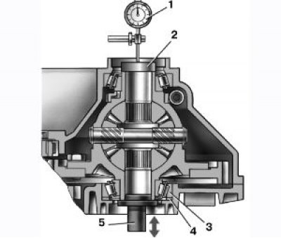 Схема подбора толщины регулировочного кольца подшипников дифференциала: 1 – индикатор; 2 – опорная пластина; 3 – подшипник дифференциала; 4 – установочное кольцо; 5 – оправка