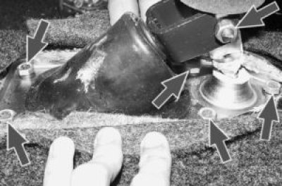 2. Отверните гайку крепления оси рычага, а затем выверните пять болтов крепления основания рычага к полу.