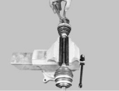 2. Для замены внутреннего шарнира равных угловых скоростей зажмите вал привода в тиски, снимите наружный и внутренний хомуты внутреннего шарнира.