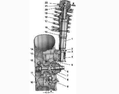 Передняя подвеска в сборе: А – контрольный размер; 1 – телескопическая стойка; 2 – гайка; 3 – эксцентриковый болт; 4 – гайка; 5 – поворотный кулак; 6 – вал привода переднего колеса; 7 – защитный чехол шарнира; 8 – наружный шарнир вала; 9 – нижний рычаг; 10 – шаровая опора; 11 – декоративный диск (колпак) колеса; 12 – ступица; 13 – тормозной диск; 14 – защитный кожух; 15 – поворотный рычаг; 16 – нижняя опорная чашка; 17 – пружина подвески; 18 – защитный чехол телескопической стойки; 19 – буфер хода сжатия; 20 – верхняя опорная чашка; 21 – подшипник верхней опоры; 22 – верхняя опора стойки