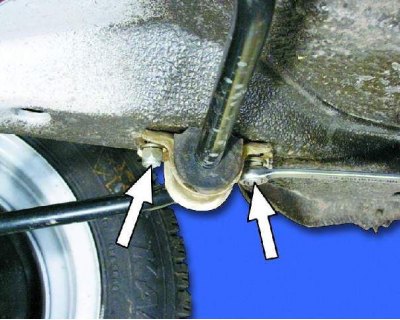 5. Если надо заменить только стойки стабилизатора или их втулки, отверните гайки крепления стоек к рычагам и сбейте стойки со штанги стабилизатора деревянным или полимерным молотком.