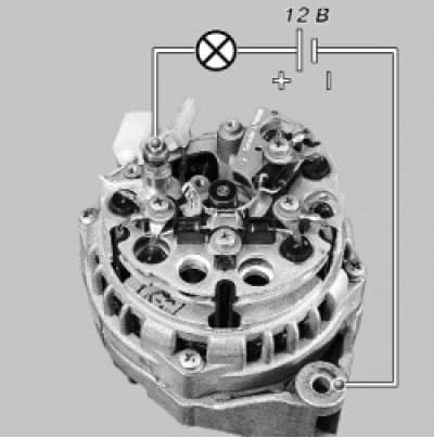 аккумуляторной батареи. Для проверки замыкания в положительных и отрицательных диодах подсоедините «+» батареи через контрольную лампу к выводу «В+» генератора, а «–» батареи — к корпусу генератора. Лампа не должна гореть. Если лампа горит, значит, есть замыкание. Блок необходимо заменить.