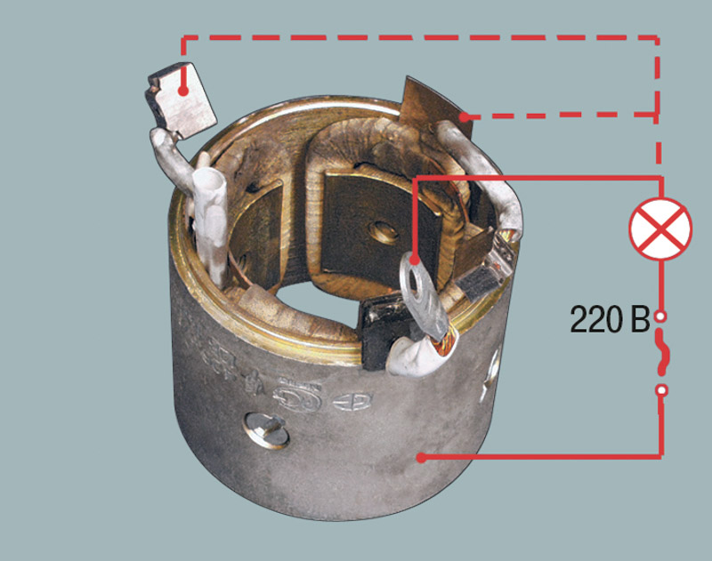 41. Проверьте состояние обмотки статора. Для этого включите контрольную лампу в цепь переменного тока напряжением 220 В и подсоедините провод к одному из выводов обмотки статора, другой конец цепи замкните на корпус. Если лампа горит, значит, повреждена изоляция обмотки. Замените обмотку или статор. Таким же образом проверьте вторую обмотку.